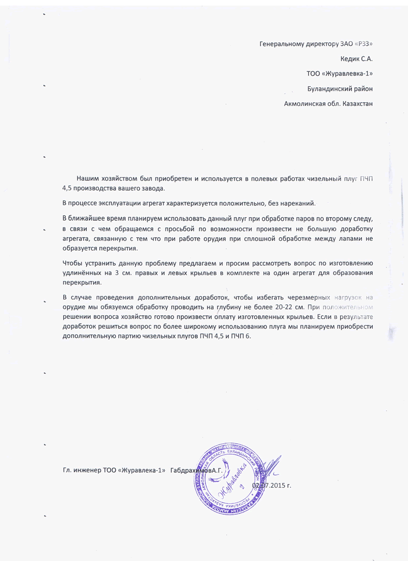 В случае проведения дополнительных доработок, чтобы избегать чрезмерных нагрузок на орудие, мы обязуемся обработку проводить на глубину не более 20-22 см. При положительном решении вопроса хозяйство готово произвести оплату изготовленных крыльев. Если в результате доработок решится вопрос по более широкому использованию плуга, мы планируем приобрести дополнительную партию плугов ПЧП-4,5 и ПЧ-6.